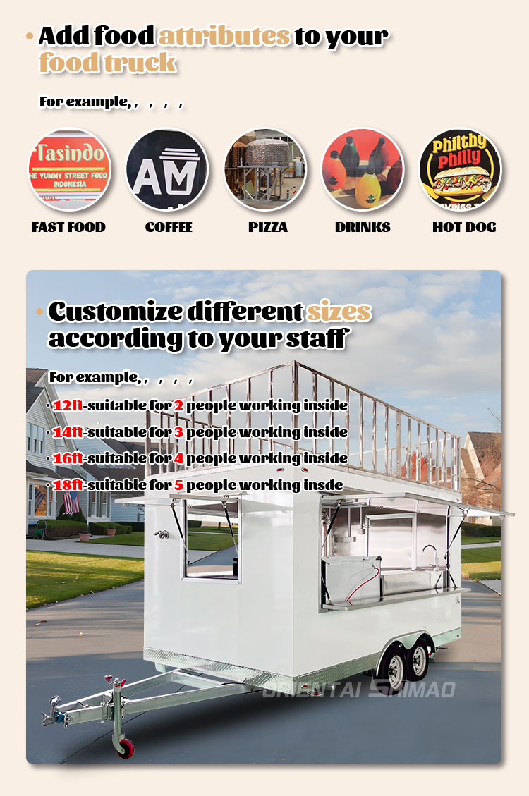 आकार अनुकूलन: पारंपरिक सीमाओं से परे, हम पारंपरिक खाद्य ट्रकों के आकार ढांचे को तोड़ते हैं और आपको आकार अनुकूलन समाधान की असीमित संभावनाएं प्रदान करते हैं। चाहे आप एक ऐसे मिनी फूड ट्रक की तलाश कर रहे हों जो छोटा और उत्तम हो, शहर की गलियों में यात्रा करना आसान हो, या एक लक्जरी मोबाइल रेस्तरां जो अधिक ग्राहकों और उपकरणों को समायोजित करने के लिए एक विशाल स्थान की इच्छा रखता हो, हम एक खाद्य ट्रक आकार बनाने के लिए आपकी विशिष्ट आवश्यकताओं के अनुसार सटीक माप और सावधानीपूर्वक डिजाइन कर सकते हैं जो वास्तविक जरूरतों को पूरा करता है और रचनात्मकता से भरा है।