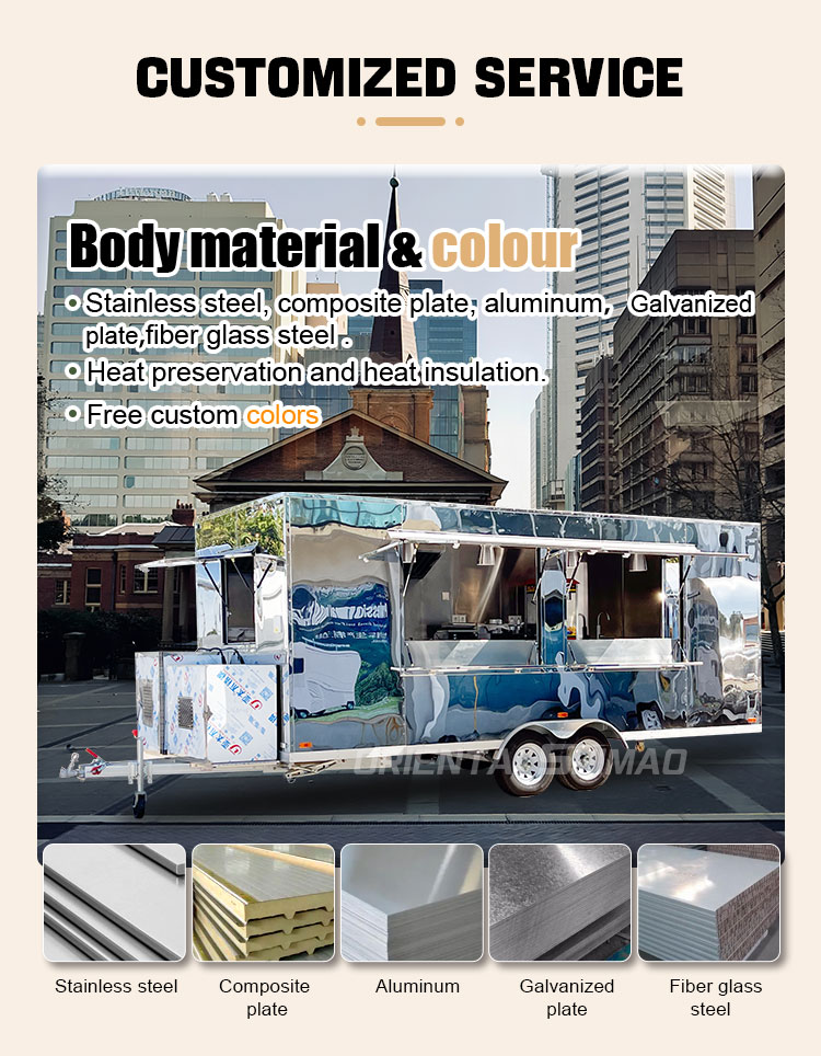 मुख्य सामग्री के लिए, हमने उच्च गुणवत्ता वाले 304 स्टेनलेस स्टील को चुना, जो अपने उत्कृष्ट संक्षारण प्रतिरोध और उत्कृष्ट स्थायित्व के लिए जाना जाता है, और विभिन्न पर्यावरणीय परिस्थितियों में स्थिर प्रदर्शन बनाए रख सकता है, यह सुनिश्चित करते हुए कि हमारे खाद्य कारवां उत्पाद लंबी अवधि में भी अपनी उत्कृष्ट गुणवत्ता और कार्यक्षमता बनाए रख सकते हैं और विभिन्न प्रकार की चुनौतियों का सामना कर सकते हैं। 304 स्टेनलेस स्टील में संक्षारण के प्रति उत्कृष्ट प्रतिरोध है, जिससे ट्रक पर ऑक्सीकरण या जंग का आसानी से प्रभाव नहीं पड़ता है, जो इसकी सेवा जीवन को काफी हद तक बढ़ा देता है। 304 स्टेनलेस स्टील का उत्कृष्ट संक्षारण प्रतिरोध ट्रक को ऑक्सीकरण या जंग के प्रति कम संवेदनशील बनाता है, जिससे उनकी सेवा जीवन में काफी वृद्धि होती है।