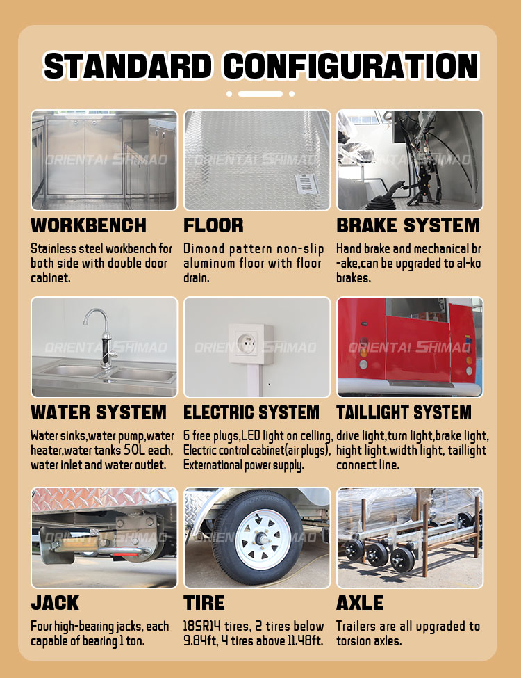 अनुकूलित डिजाइन: आपके व्यवसाय के प्रकार और लक्ष्य ग्राहक आधार के आधार पर, हम यह सुनिश्चित करने के लिए आपके ट्रेलर के आंतरिक लेआउट, उपकरण कॉन्फ़िगरेशन और बाहरी डिज़ाइन को अनुकूलित कर सकते हैं कि यह आपकी ब्रांड छवि और परिचालन आवश्यकताओं से मेल खाता है।