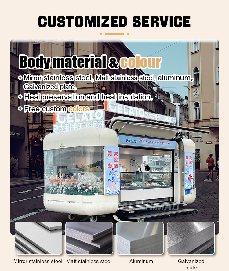 गोल्डन स्टेनलेस स्टील: फूड ट्रक का बाहरी हिस्सा उच्च गुणवत्ता वाले गोल्डन स्टेनलेस स्टील से बना है। इस सामग्री में न केवल उत्कृष्ट संक्षारण और घर्षण प्रतिरोध है, बल्कि सुनहरी उपस्थिति दृश्य सुंदरता और उच्च श्रेणी की भावना को भी बढ़ाती है, ताकि खाद्य ट्रक विभिन्न वातावरणों में खड़ा रह सके।