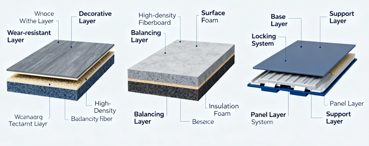4. तीन-परत फर्श के लिए कौन से सामग्री विकल्प उपलब्ध हैं?