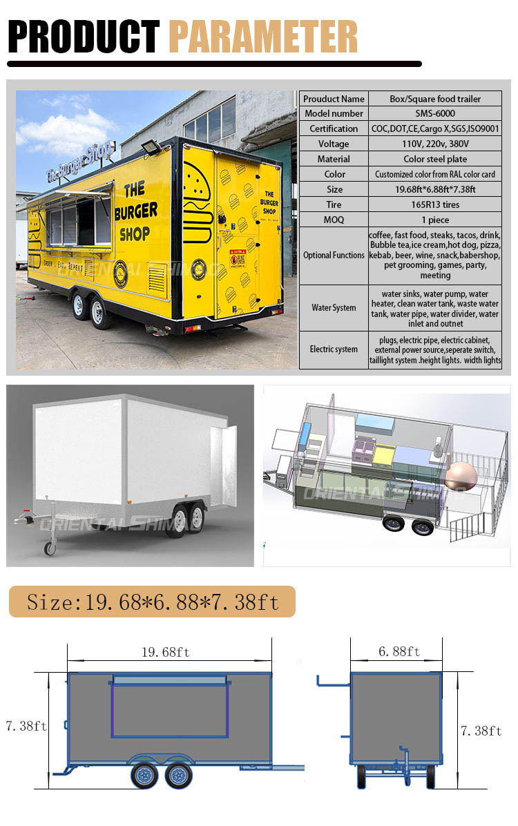 शेप 4एम नाइट मार्केट बीबीक्यू फूड ट्रेलर उत्पाद के आंतरिक उपकरण के विन्यास को ग्राहक की विशिष्ट आवश्यकताओं को पूरा करने के लिए अनुकूलित किया जा सकता है, लेकिन इसमें आमतौर पर निम्नलिखित प्रमुख घटक शामिल होंगे: