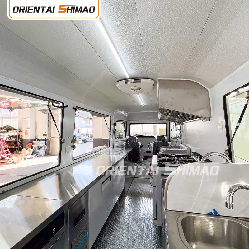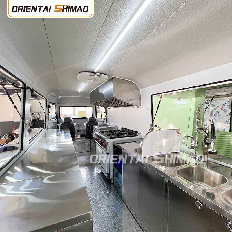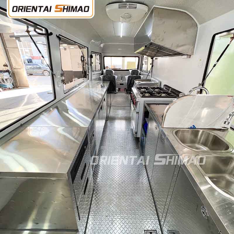 स्टेनलेस स्टील इंटीरियर: इंटीरियर स्टेनलेस स्टील से बना है, जो एक मजबूत और टिकाऊ इंटीरियर सुनिश्चित करता है जिसे साफ करना और रखरखाव करना आसान है और खाद्य स्वच्छता मानकों को पूरा करता है। स्टेनलेस स्टील के उपयोग से न केवल खाद्य ट्रक की सेवा जीवन में सुधार होता है, बल्कि भोजन तैयार करने की प्रक्रिया की स्वच्छता और सुरक्षा भी सुनिश्चित होती है।