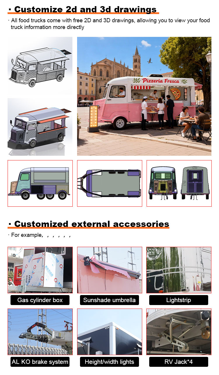 मॉडलिंग और शैली: खाद्य ट्रक की उपस्थिति मॉडलिंग और शैली ग्राहकों को आकर्षित करने के लिए एक महत्वपूर्ण कारक है। इसे ग्राहकों की ब्रांड छवि, व्यावसायिक विशेषताओं या व्यक्तिगत प्राथमिकताओं, जैसे सुव्यवस्थित डिजाइन, रेट्रो शैली, आधुनिक सादगी आदि के अनुसार अनुकूलित किया जा सकता है।