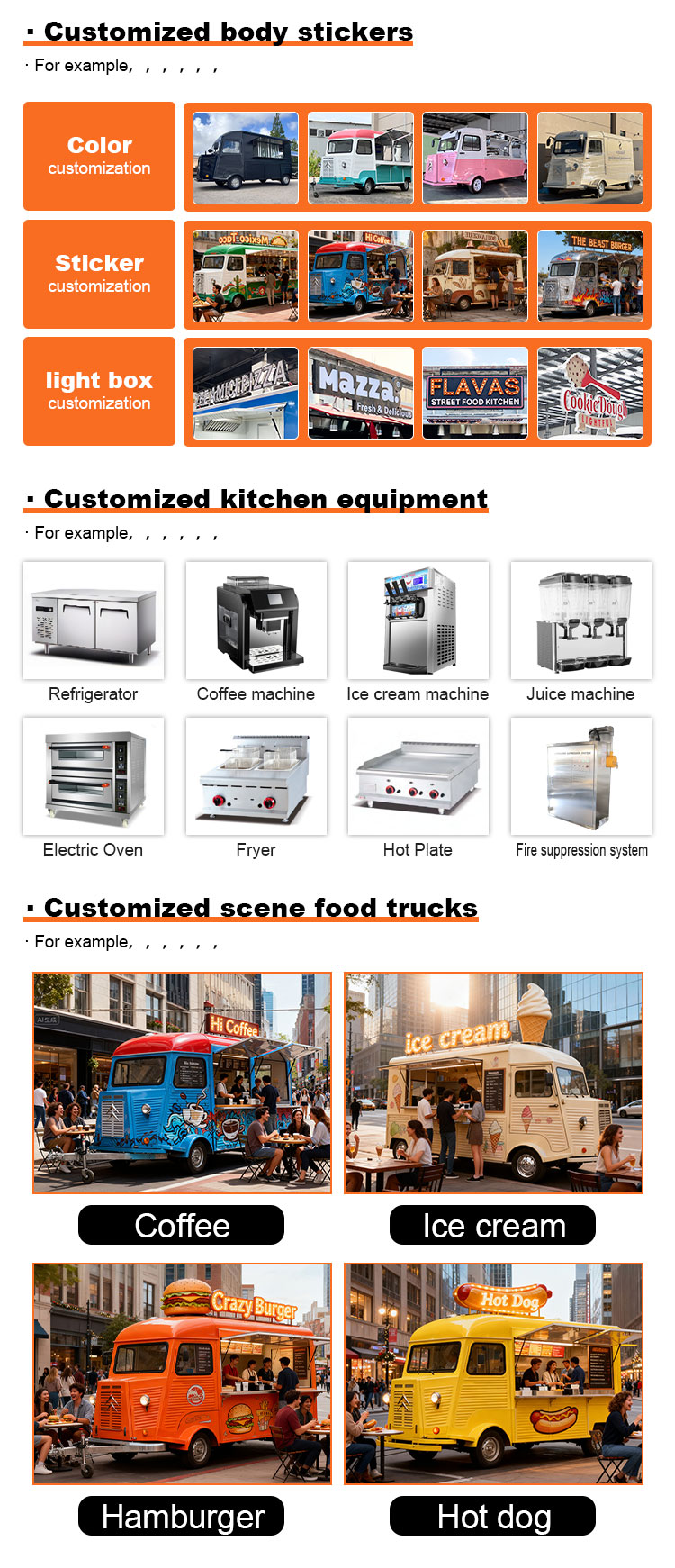 अतिरिक्त कार्य: खाद्य ट्रक की व्यावहारिकता और सुरक्षा को बढ़ाने के लिए ग्राहक की जरूरतों के अनुसार अन्य अतिरिक्त कार्य जोड़ें, जैसे प्रशीतन और ताजगी का संरक्षण, हीटिंग और गर्मी संरक्षण, जलरोधक और बिजली-विरोधी इत्यादि।