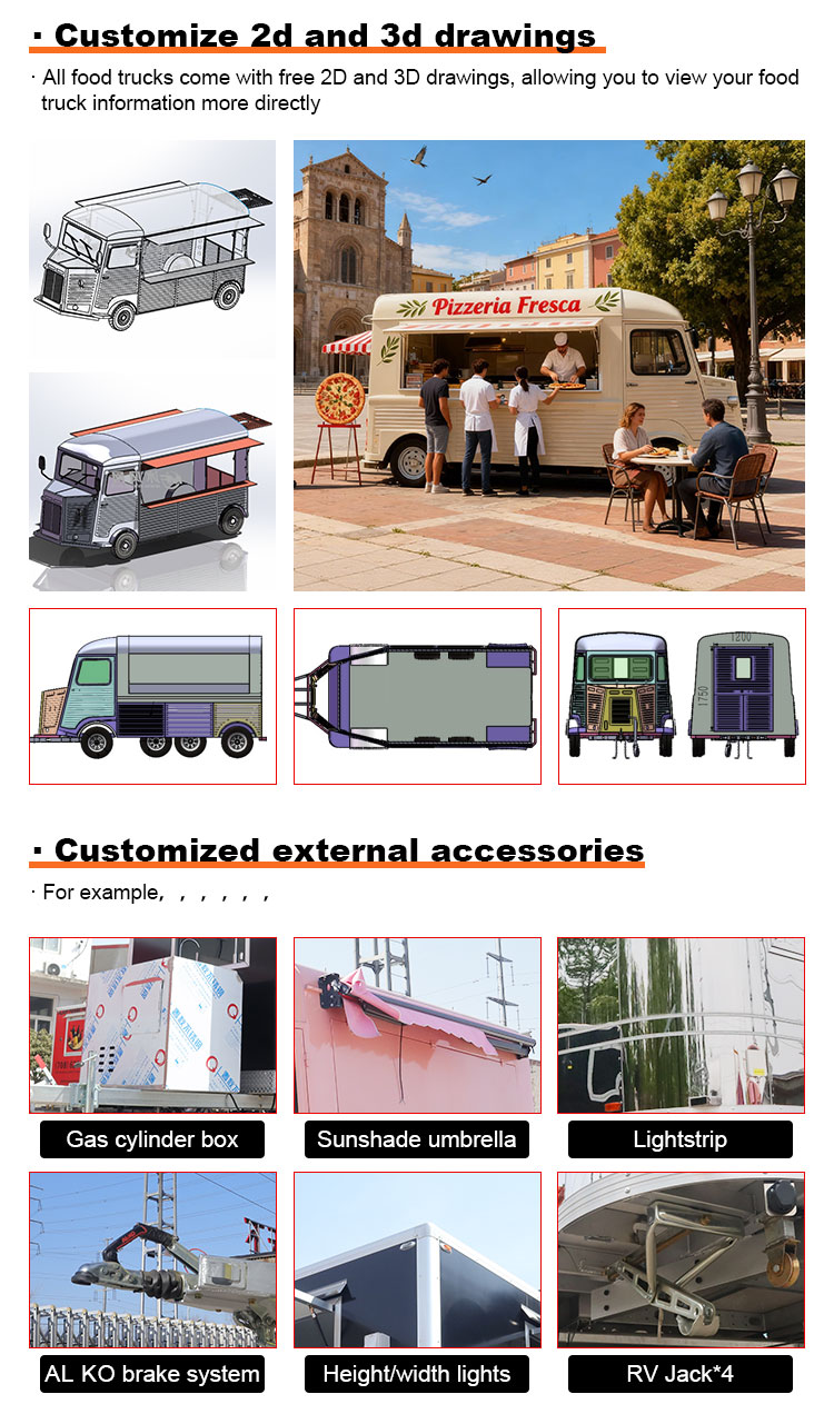 मॉडलिंग और शैली: खाद्य ट्रक की उपस्थिति मॉडलिंग और शैली ग्राहकों को आकर्षित करने के लिए एक महत्वपूर्ण कारक है। इसे ग्राहकों की ब्रांड छवि, व्यावसायिक विशेषताओं या व्यक्तिगत प्राथमिकताओं, जैसे सुव्यवस्थित डिजाइन, रेट्रो शैली, आधुनिक सादगी आदि के अनुसार अनुकूलित किया जा सकता है।